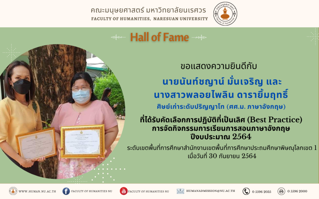 ขอแสดงความยินดีกับ นายนันท์ชญาน์ มั่นเจริญและนส.พลอยไพลิน ดารายิ้มฤทธิ์ ศิษย์เก่าระดับบัณฑิตศึกษา สาขาวิชาภาษาอังกฤษ