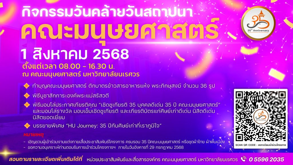 ขอเชิญร่วมงาน “ครบรอบ 35 ปี วันคล้ายวันสถาปนา คณะมนุษยศาสตร์ มหาวิทยาลัยนเรศวร”