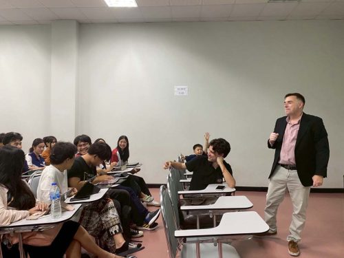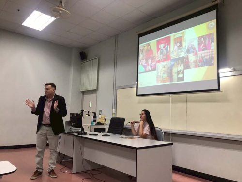 En esta ocasión se contó con la valiosa participación de Andrés Aroca Huélamo, hablante nativo y empresario español, y de Seetala Suwanpratest, ciudadana tailandesa que ha residido y trabajado en varias empresas en España durante muchos años. Ambos ofrecieron conferencias y compartieron conocimientos, experiencias y perspectivas bajo el tema «Sociedad y cultura de España y de los países hispanohablantes». A la actividad asistieron un total de cincuenta y un estudiantes de segundo y tercer curso del 𝘮𝘪𝘯𝘰𝘳 en español, así como siete miembros del personal de la Facultad de Humanidades.