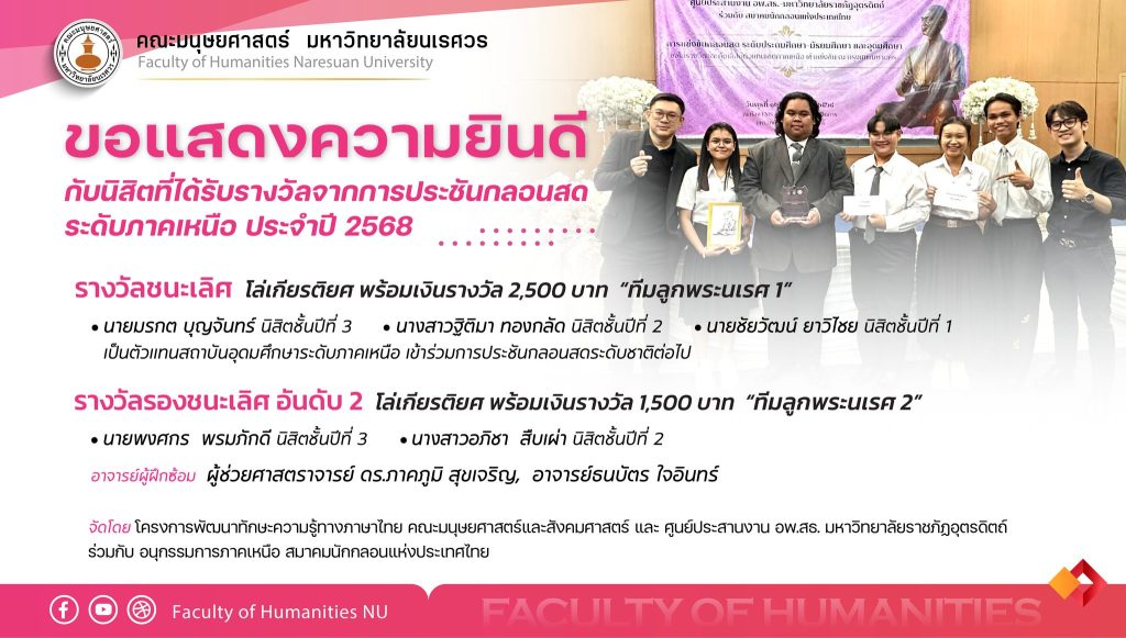 คณะมนุษยศาสตร์ มหาวิทยาลัยนเรศวร ขอแสดงความยินดีกับนิสิตที่ได้รับรางวัลจากการประชันกลอนสด ระดับภาคเหนือ ประจำปี 2568