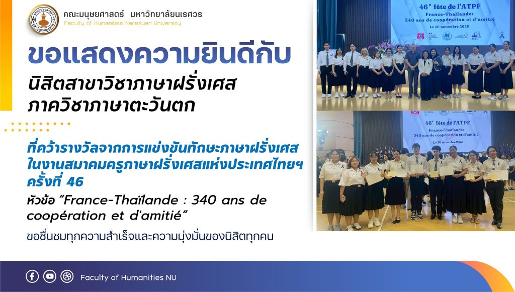 สาขาวิชาภาษาฝรั่งเศส ภาควิชาภาษาตะวันตก คณะมนุษยศาสตร์ มหาวิทยาลัยนเรศวร นำนิสิตเข้าร่วมแข่งขันทางวิชาการในงานกิจกรรมประจำปีของสมาคมครูภาษาฝรั่งเศสแห่งประเทศไทย ในพระราชูปถัมภ์ฯ ครั้งที่ 46 จัดขึ้นเมื่อวันที่ 30 พฤศจิกายน พ.ศ. 2568 ณ โรงเรียนอัสสัมชัญ กรุงเทพมหานคร ภายใต้หัวข้อ “France-Thaïlande : 340 ans de coopération et d’amitié” หรือ การฉลองครบรอบ 340 ปี ความสัมพันธ์ไทย–ฝรั่งเศส