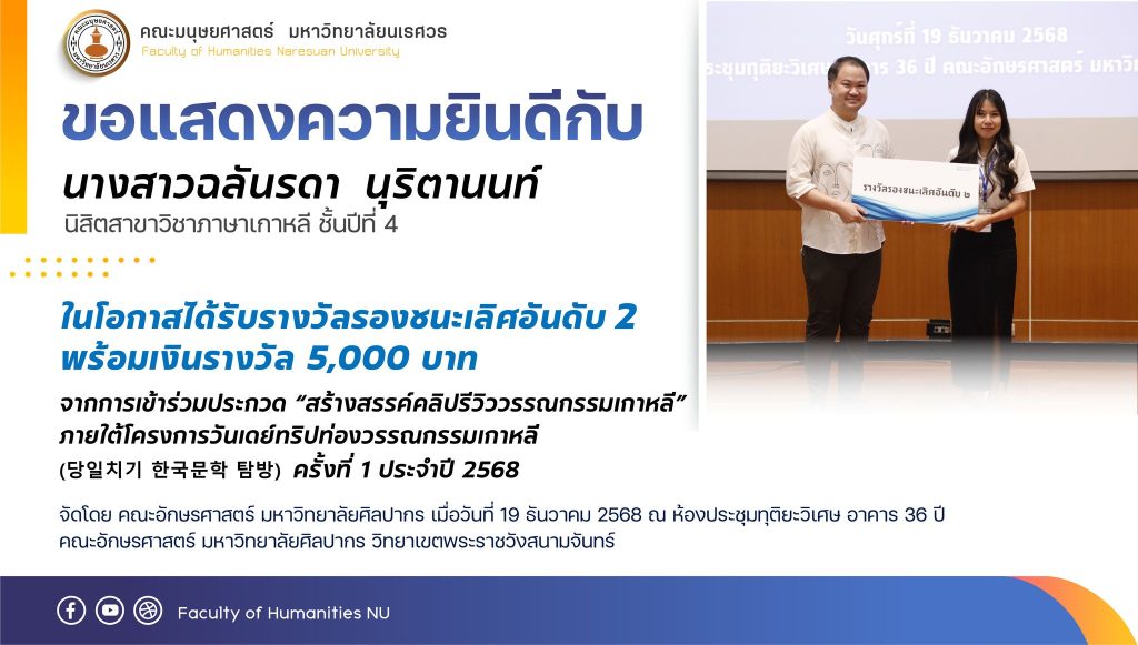 ขอแสดงความยินดีกับ นางสาวฉลันรดา นุริตานนท์ นิสิตสาขาวิชาภาษาเกาหลี ชั้นปีที่ 4 ได้รับรางวัลรองชนะเลิศอันดับ 2 พร้อมเงินรางวัล 5,000 บาท จากการประกวด “สร้างสรรค์คลิปปรีวิววรรรณกรรมเกาหลี” ภายใต้โครงการวันเดย์ทริปท่องเที่ยววรรณกรรมเกาหลี ครั้งที่ 1 ประจำปี 2568 จัดโดย คณะอักษรศาสตร์ มหาวิทยาลัยศิลปกร เมื่อวันที่ 19 ธันวาคม 2568 ณ ห้องประชุมทุติยะวิเศษ อาคาร 36 ปี