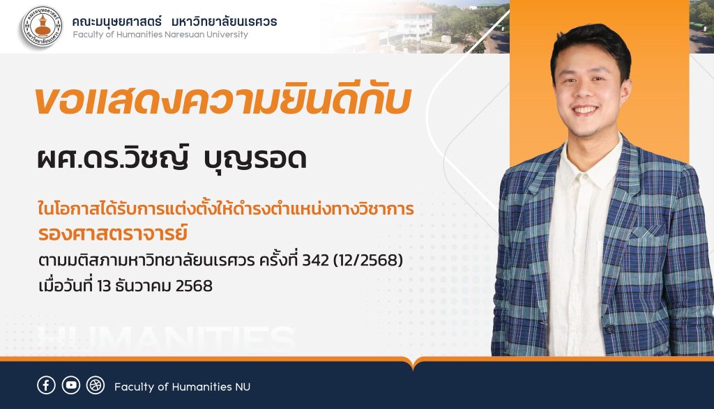 ขอแสดงความยินดีกับ ผศ.ดร.วิชญ์ บุญรอด ในโอกาสได้รับการแต่งตั้งให้ดำรงตำแหน่งทางวิชาการ “รองศาสตราจารย์” ตามมติสภามหาวิทยาลัยนเรศวร ครั้งที่ 342 (12/2568) เมื่อวันที่ 13 ธันวาคม 2568