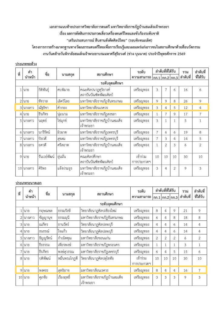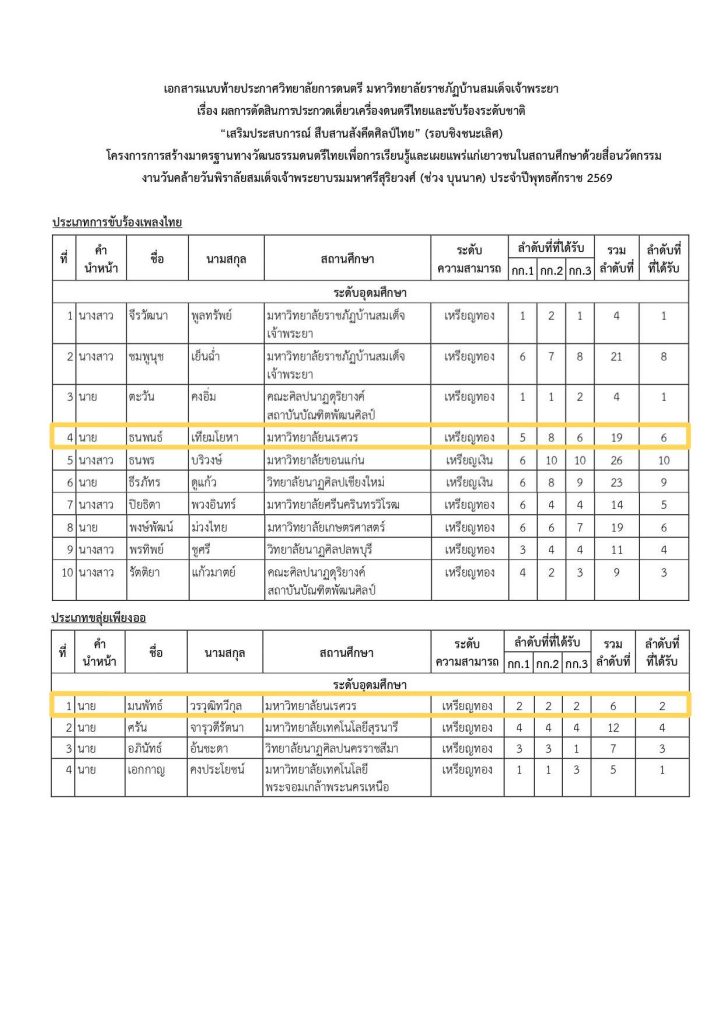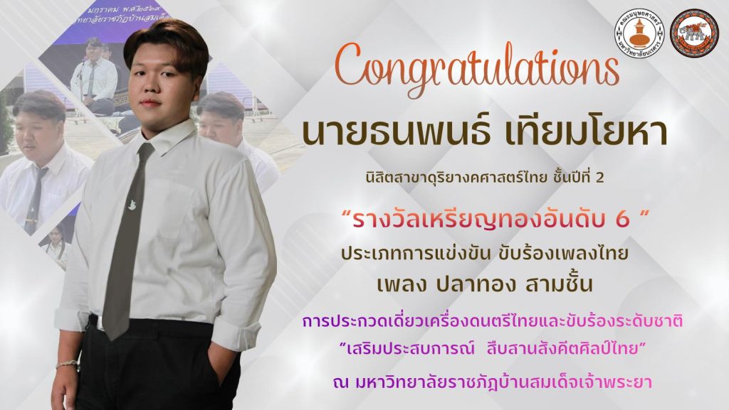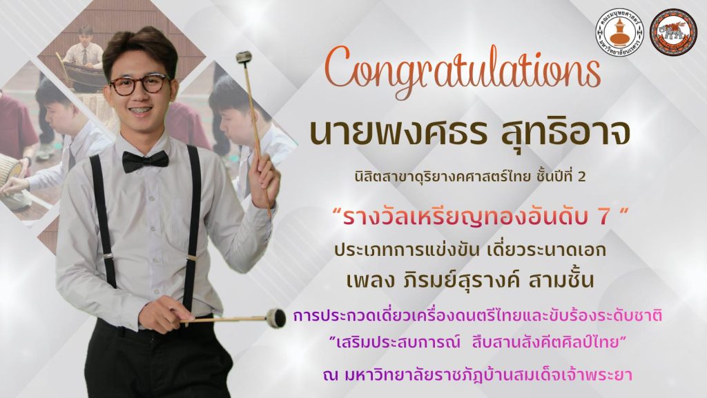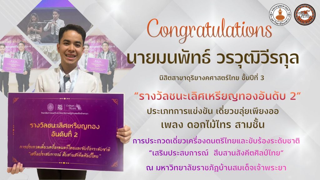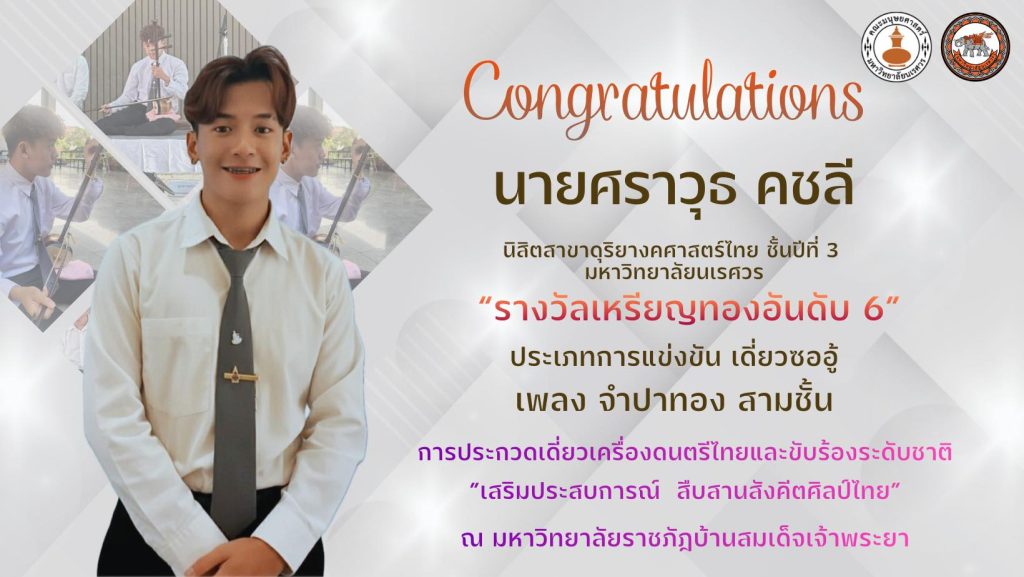 คณะมนุษยศาสตร์ มหาวิทยาลัยนเรศวร ขอแสดงความยินดีกับนิสิตสาขาวิชาดุริยางคศาสตร์ไทย ภาควิชาดนตรี จำนวน 5 คน ที่สร้างชื่อเสียงให้แก่คณะและมหาวิทยาลัย จากการเข้าร่วม การประกวดเดี่ยวเครื่องดนตรีไทยและขับร้องระดับชาติ “เสริมประสบการณ์สืบสานสังคีตศิลป์ไทย” ประจำปี พ.ศ. 2568 ซึ่งจัดขึ้น ณ วิทยาลัยการดนตรี มหาวิทยาลัยราชภัฏบ้านสมเด็จเจ้าพระยา และสามารถคว้ารางวัลระดับเหรียญทองจากหลายรายการแข่งขันได้อย่างน่าชื่นชม