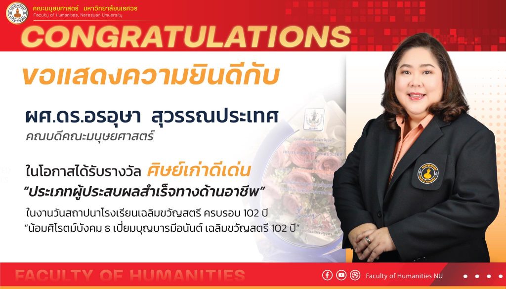 ขอแสดงความยินดีกับ ผศ.ดร.อุษา สุวรรณประเทศ ในโอกาสได้รับคัดเลือกเป็นศิษย์เก่าดีเด่น “ประเภทผู้ประสบผลสำเร็จทางด้านอาชีพ” ของโรงเรียนเฉลิมขวัญสตรี ครบรอบ 102 ปี “น้อมศิโรตม์บังคม ธ เปี่ยมบุญบารมีอนันต์ เฉลิมขวัญสตรี 102 ปี”