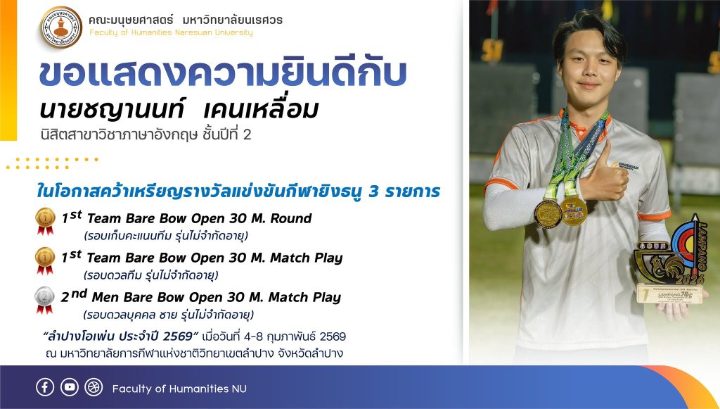ขอแสดงความยินดีกับ นายชญานนท์ เคนเหลื่อม นิสิตสาขาวิชาภาษาอังกฤษ ชั้นปีที่ 2 ในโอกาสคว้าเหรียญรางวัลแข่งขันกีฬายิงธนู 3 รายการ