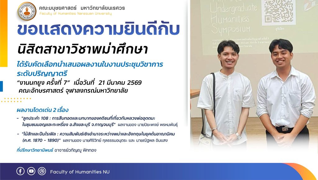 ขอแสดงความยินดีกับ นิสิตสาขาวิชาพม่าศึกษา ได้รับคัดเลือกนำเสนอผลงานในงานประชมวิชาการระดับปริญญาตรี “งานนกยูง ครั้งที่ 7” เมื่อวันที่ 21 มีนาคม 2569 คณะอักษรศาสตร์ จุฬาลงกรณ์มหาวิทยาลัย
