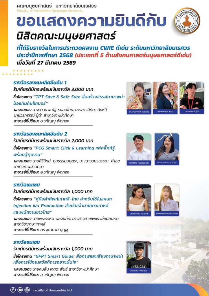 ที่ได้รับรางวัลการประกวดผลงาน CWIE ดีเด่น ระดับมหาวิทยาลัย ประจำปีการศึกษา 2568